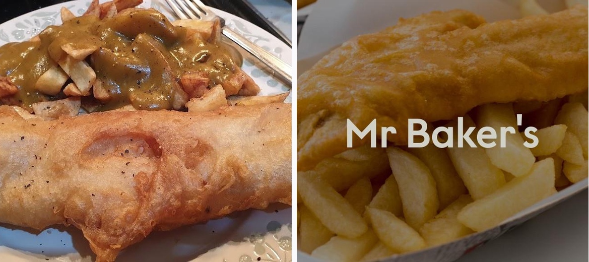 Mr Baker's specializes in fish and chips, along with a variety of other British favorites like pies and burgers.